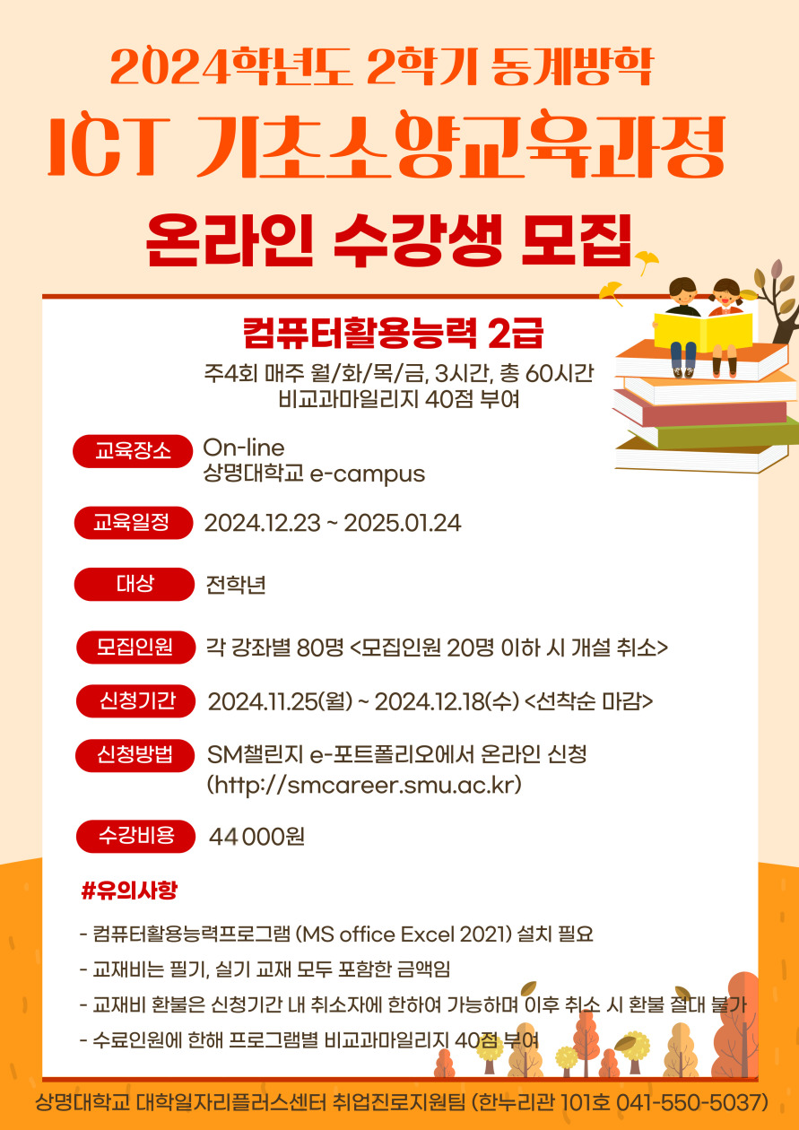 | 상명 [진로취업] | [취업진로지원팀] 2024학년도 동계방학 ICT 기초소양교육 신청 안내 |