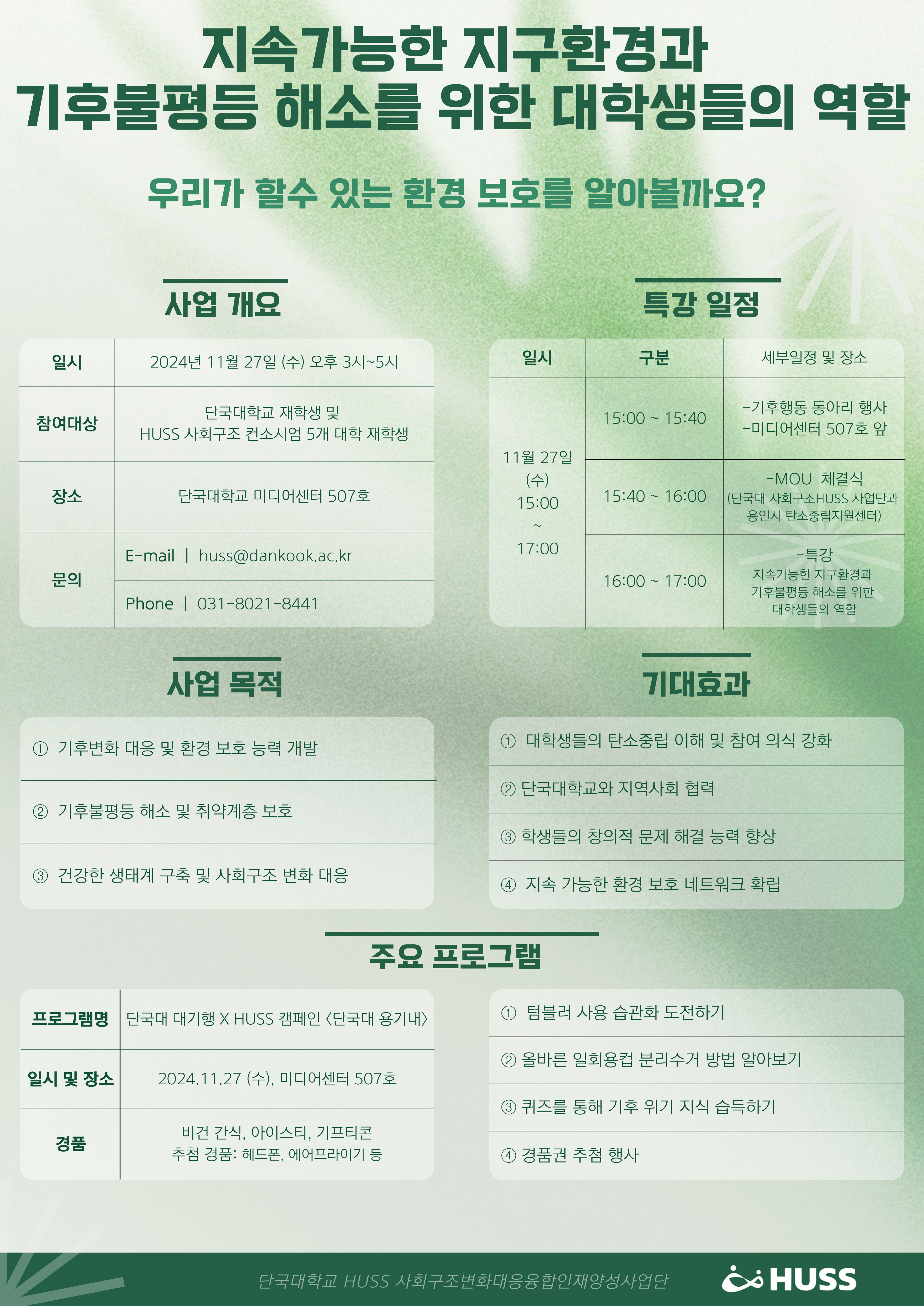 | 상명 [비교과] | [HUSS 인문사회 융합인재양성사업단] 인문사회융합인재양성사업(HUSS) ‘지속가능한 지구환경과 기후불평등 해소를 위한 대학생들의 역할' 프로그램 안내 |